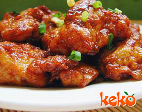 2.将炸油200克烧热,放进鸡块炸熟,捞出沥干。