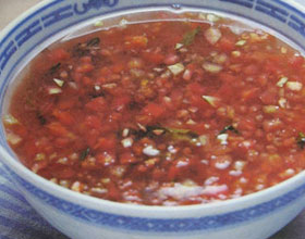 绿茶番茄汤:'1.番茄洗净,用开水烫后去皮,捣碎。2.和绿茶混合置于汤碗内。3.立即冲入沸水400毫升即成。...